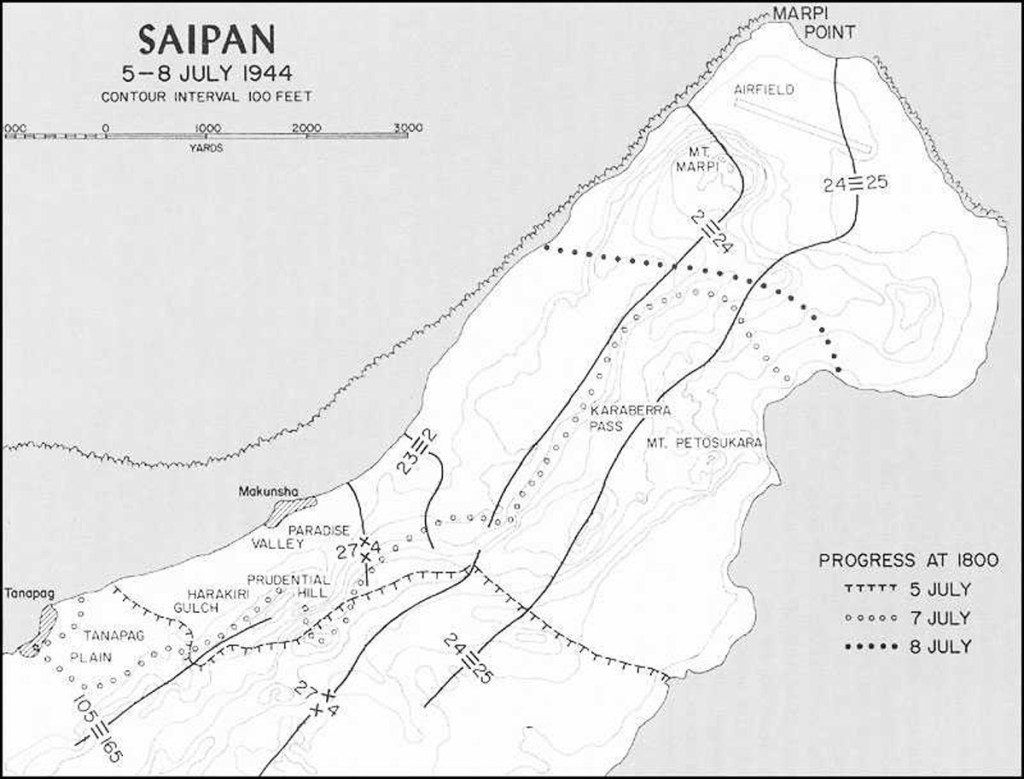 Late that afternoon, Marine LtGen. Holland Smith had visited the 27th Infantry Division’s headquarters, relaying to MG George Griner that they expected the attack to head towards him down the Tanapag Plain along Saipan’s northwestern shore. They estimated it would occur either that night or the early next morning, on July 7. Such attacks were not all out of the ordinary to the Soldiers or Marines by this point, and Griner replied that his troops were ready.